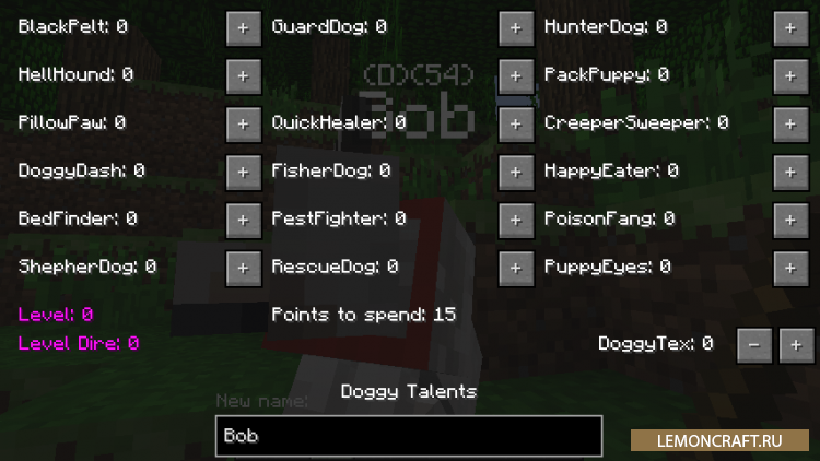 С помощью мода Doggy Talents вы сможете обучить, прокачать свою собаку, она получит новые навыки, а вы получите новые предметы. Для прокачки собак доступно 15 разных навыков. Теперь ваш питомец будет не просто декорацией, но и надежным помощником и другом.