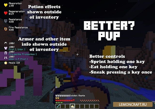 Мод на PVP Better PvP предназначен для любителей игры майнкрафт в стиле РПГ, на экран будет выводится информация о статусе брони и предметов, наложенных эффектах, информация о получаемом опыте и куча другой полезной информации. Если в настройках мода включить всю доступную к выводу информацию, она займет практически весь экран монитора. Выберите именно то, что вам нужно, остальное можно просто отключить.